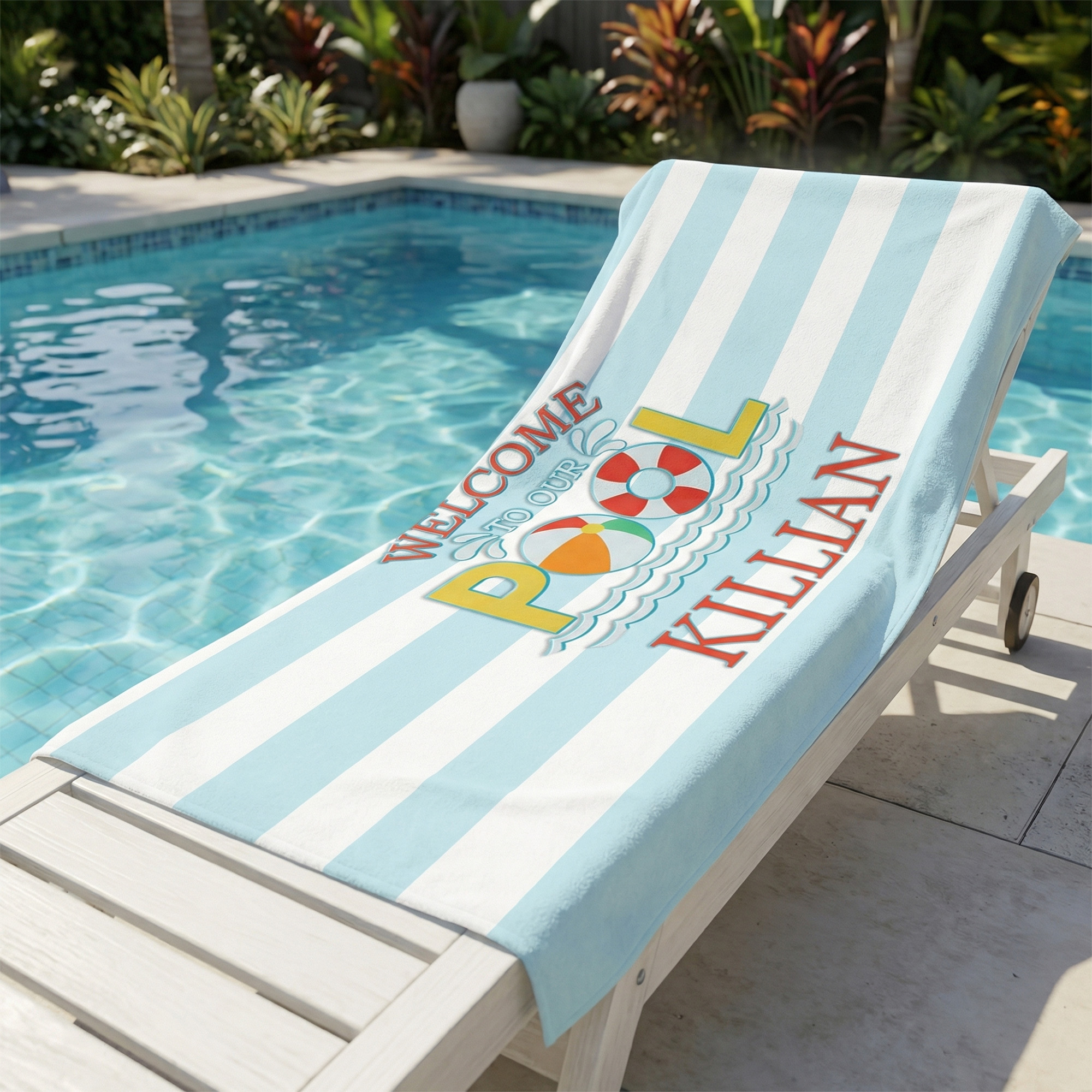 Bright Striped Design - This beach towel features a fun striped pattern with a cheerful “Welcome to Our Pool” design that brings a playful summer vibe. Its colorful and stylish look stands out at the beach, by the pool, or during family vacations, adding extra fun for kids.