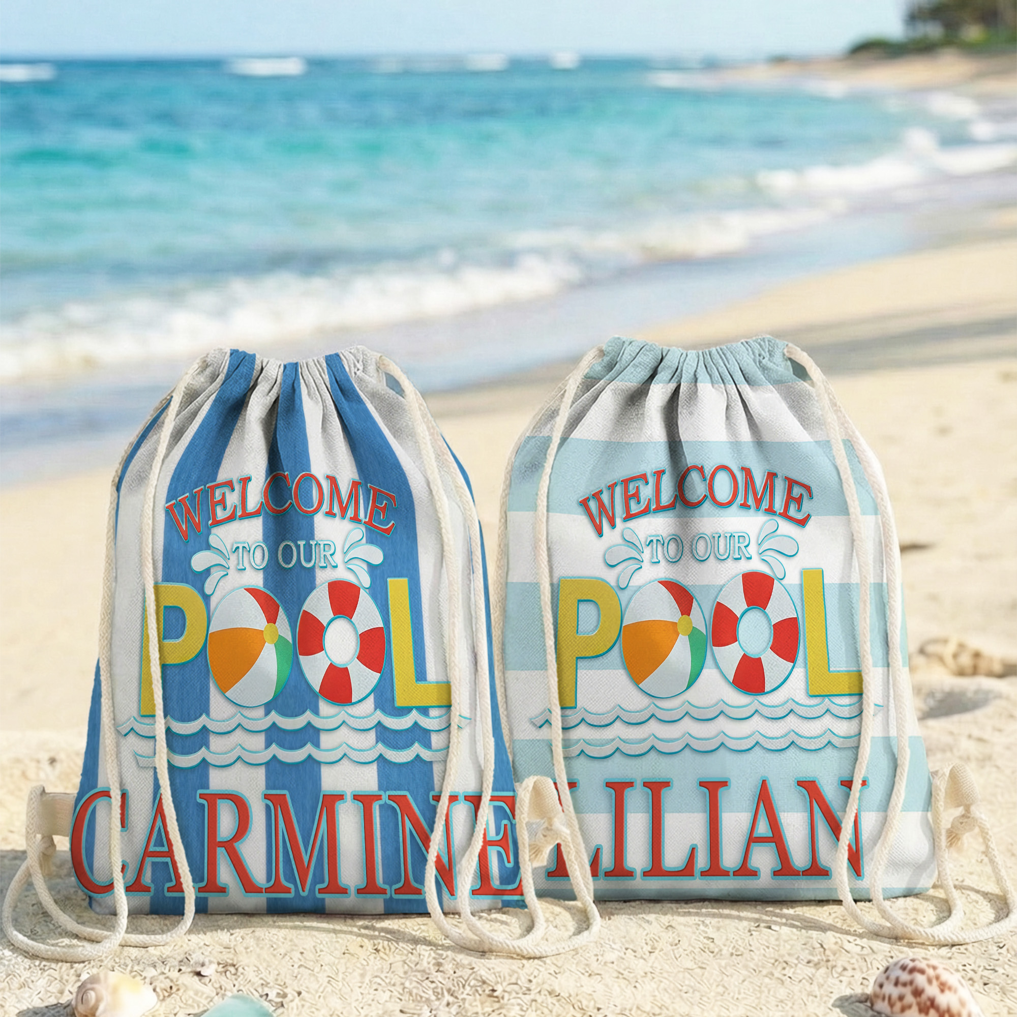 Custom Name Welcome to Our Pool Striped Beach Towel with Drawstring Bag, Quick Dry Microfiber Pool Towel, Summer Party Favor, Vacation Gift for Kids